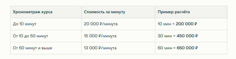 - Курс 60 минут = 10 мин × 20 000 ₽ + 40 мин × 15 000 ₽ + 10 мин × 13 000 ₽ = 650 000 ₽